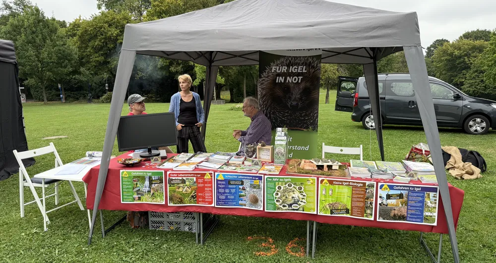 Beim Sommerfest im Botanischen Garten Wuppertal durften wir mit unserem Stand vom Netzwerk Igel e.V. ein überwältigendes Interesse erleben. Viele Besucher haben sich nach Möglichkeiten für einen igelfreundlichen Garten erkundigt, andere interessierten sich für das Ehrenamt an sich oder brachten ihre Fragen rund um den Igel mit. Besonders schön war es, dass auch Menschen, die bereits Igel im eigenen Garten haben, zu uns kamen und sich trotzdem noch weiter informieren wollten.